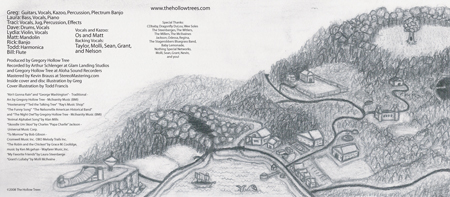 Cover Illustration by Todd Francis - Todd is a great illustrator who I've known for many years. He works mostly in the skateboard industry. He is also an excellent harmonica player who plays on the track 8 " Ray's Music Shop." Inside cover illustration by Gregory Hollow Tree - This is an bird's eye view of Nelsonville. It's what a seagull would see when she's flying over Beluga Bay. The album was produced by Gregory Hollow Tree. It was recorded at Glam Landing Studios and Nelsonville Sound Recordists. It was engineered by Arthur Schlenger at Glam Landing and Gregory Hollow Tree at Nelsonville Sound Recordists. It was mixed by Gregory Hollow Tree and Nelson at Nelsonville Sound Recordists. It was mastered by Kevin Brauss at StereoMastering.com.